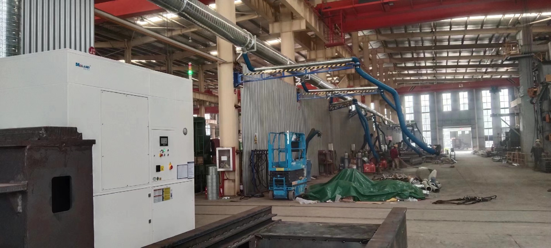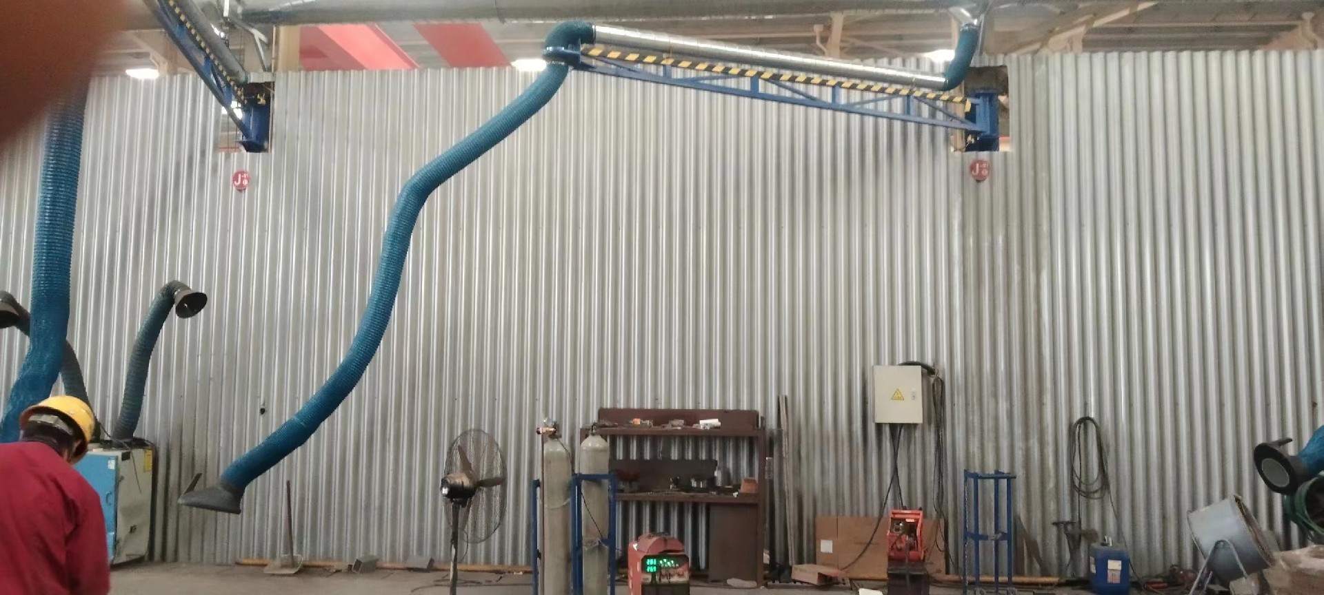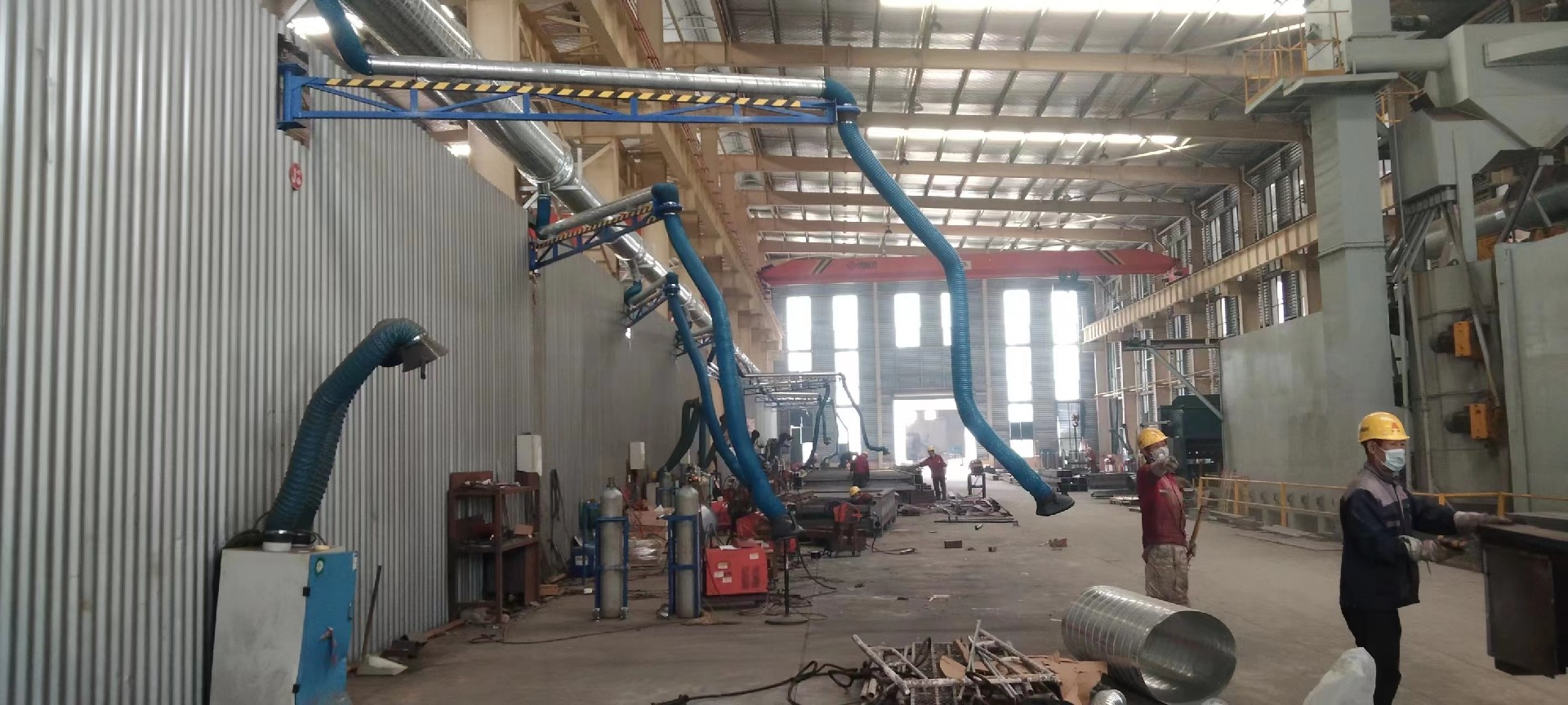 工位分布均勻且跨度不大的人工焊接工況可用懸臂式除塵每個(gè)焊接工位所產(chǎn)生的煙塵都能在產(chǎn)塵點(diǎn)得到有效的吸收,不會(huì )污染車(chē)間的其它地方。吸氣臀的骨架類(lèi)似于人的手臂,能夠在一定長(cháng)度范圍內的空間懸停。吸氣臂的外層為耐高溫軟管,不僅能夠防止火花飛濺燙傷軟管,同時(shí)軟管結構又保證了吸氣臀的移動(dòng)靈活性。在吸氣罩的位置上設計了獨特的旋轉機構,保證了吸氣罩能夠通過(guò)任意方位對準焊接位置,使吸氣臂能夠有效捕捉焊接過(guò)程中產(chǎn)生的煙塵。吸氣臀捕捉的好處是可以接近煙塵產(chǎn)生部位,采集效果較好。