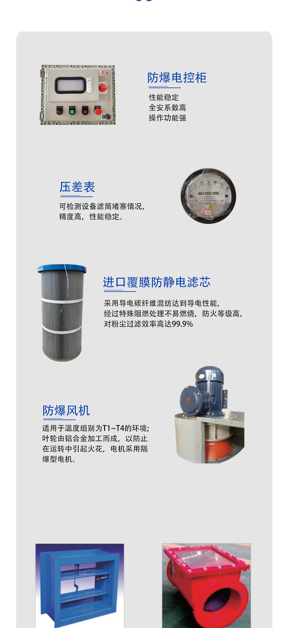 接從源頭提取粉塵,以確保粉塵不會(huì )逸散到工作場(chǎng)所。加裝防爆裝置,以確保員工的安全,并最大限度地減少工廠(chǎng)和設備的損壞。防護所謂的袋進(jìn)/袋出(BIBO)技術(shù)用于在更換過(guò)濾器時(shí)防止操作員暴露和收集的材料泄漏。卸料系統采用連續襯套技術(shù),在系統的自動(dòng)脈沖清潔過(guò)程中,將濾筒釋放到料斗的灰塵控制住。