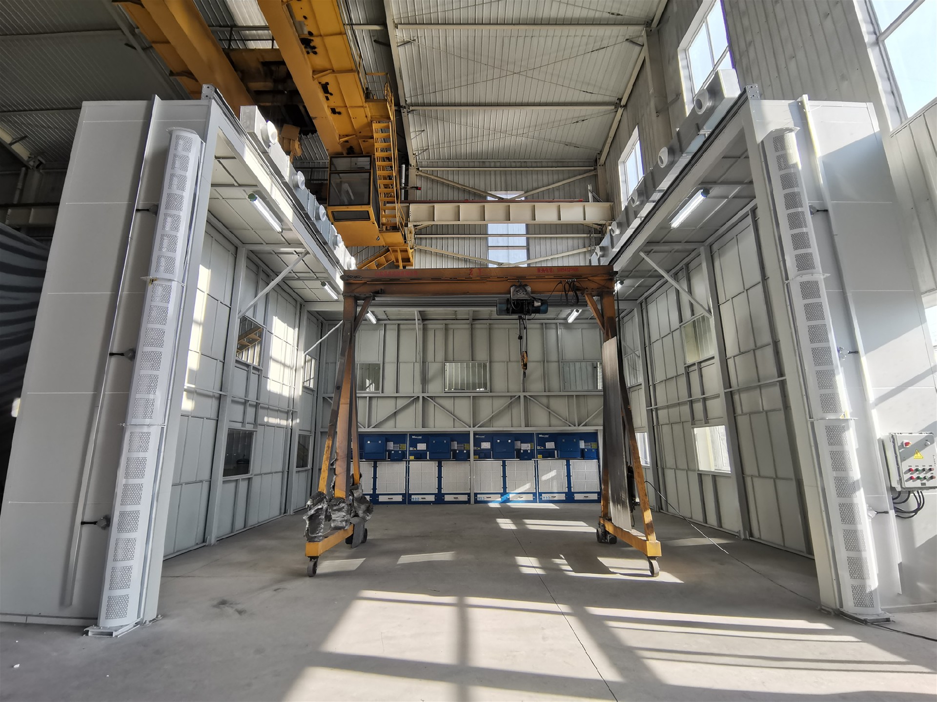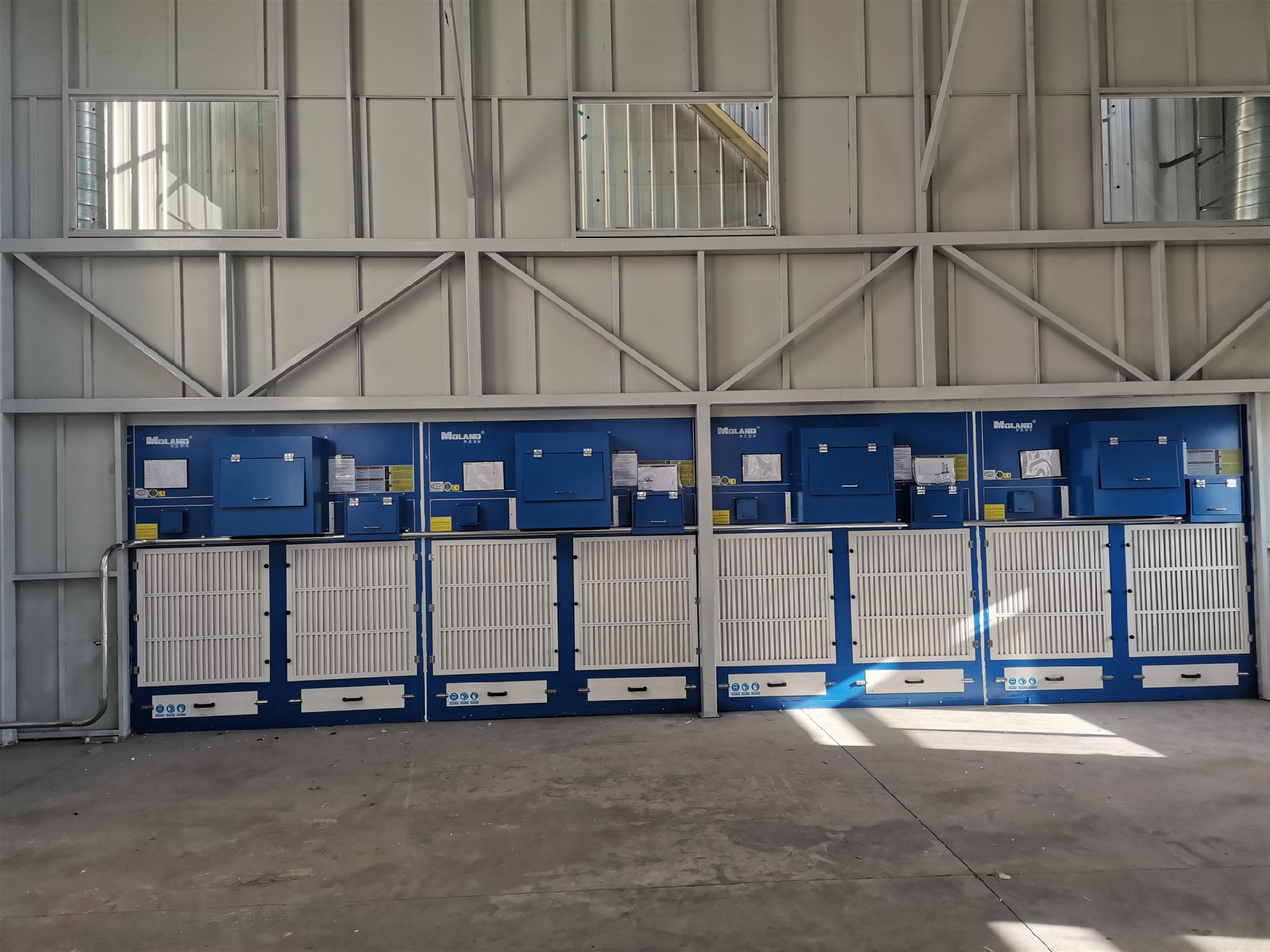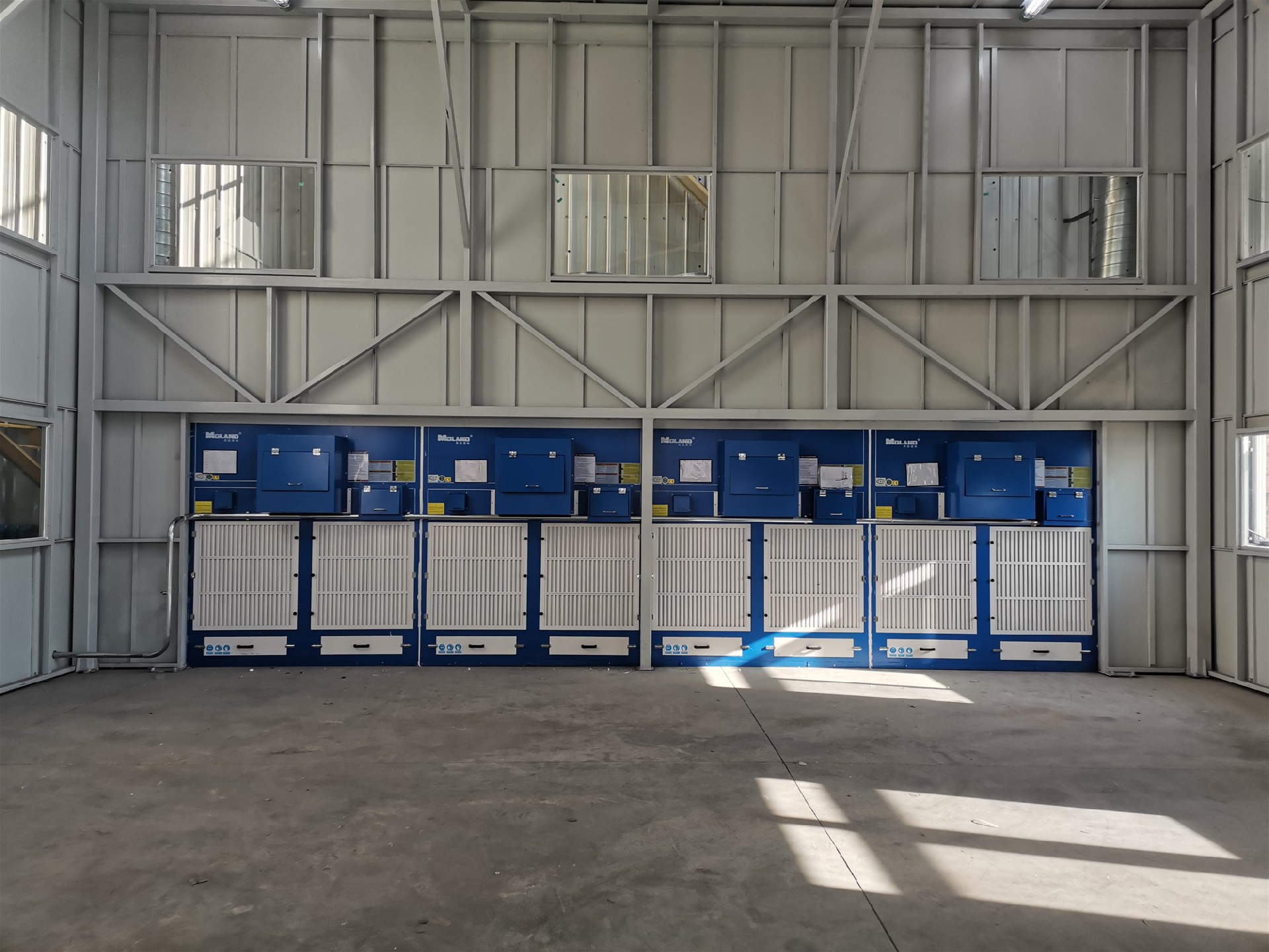 科技美藍,智慧除塵,大家好,今天給大家分享大型工件打磨拋光產(chǎn)生的粉塵怎樣處理?這是我們?yōu)槟衬茉囱b備生產(chǎn)企業(yè)鈦合金打磨車(chē)間設計制作的防爆無(wú)塵打磨除塵系統,客戶(hù)現場(chǎng)打磨工件比較大,需要行車(chē)吊裝工件,且打磨時(shí)粉塵量比較大,了解具體工況及跟客戶(hù)溝通后,采用美藍環(huán)保4臺防爆款打磨除塵柜+打磨房的處理方式,打磨房尺寸10m(長(cháng))*10m(寬)*6m(高),鋼結構整體框架,防腐蝕龍骨搭建,板材選用碳鋼噴塑鈑金材質(zhì),在房頂兩側加裝送風(fēng)管道,凈化后的空氣通過(guò)管道進(jìn)入射流口吹到房間里,實(shí)現空氣內循環(huán)。并在房頂加裝一個(gè)可伸縮的電動(dòng)天幕,吊裝工件的時(shí)候收縮,作業(yè)的時(shí)候可打開(kāi)覆蓋房間。為達到良好的送風(fēng)效果,在門(mén)口兩側各加裝風(fēng)幕,形成一個(gè)無(wú)形的門(mén)簾,防止粉塵不外溢。