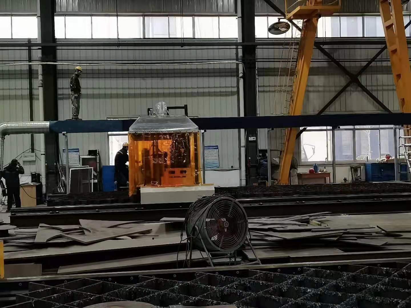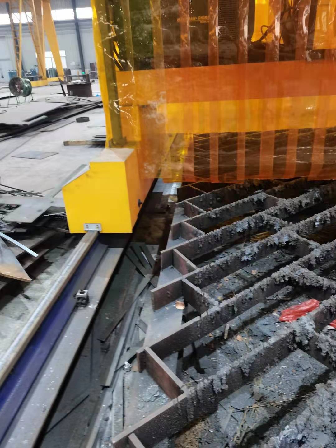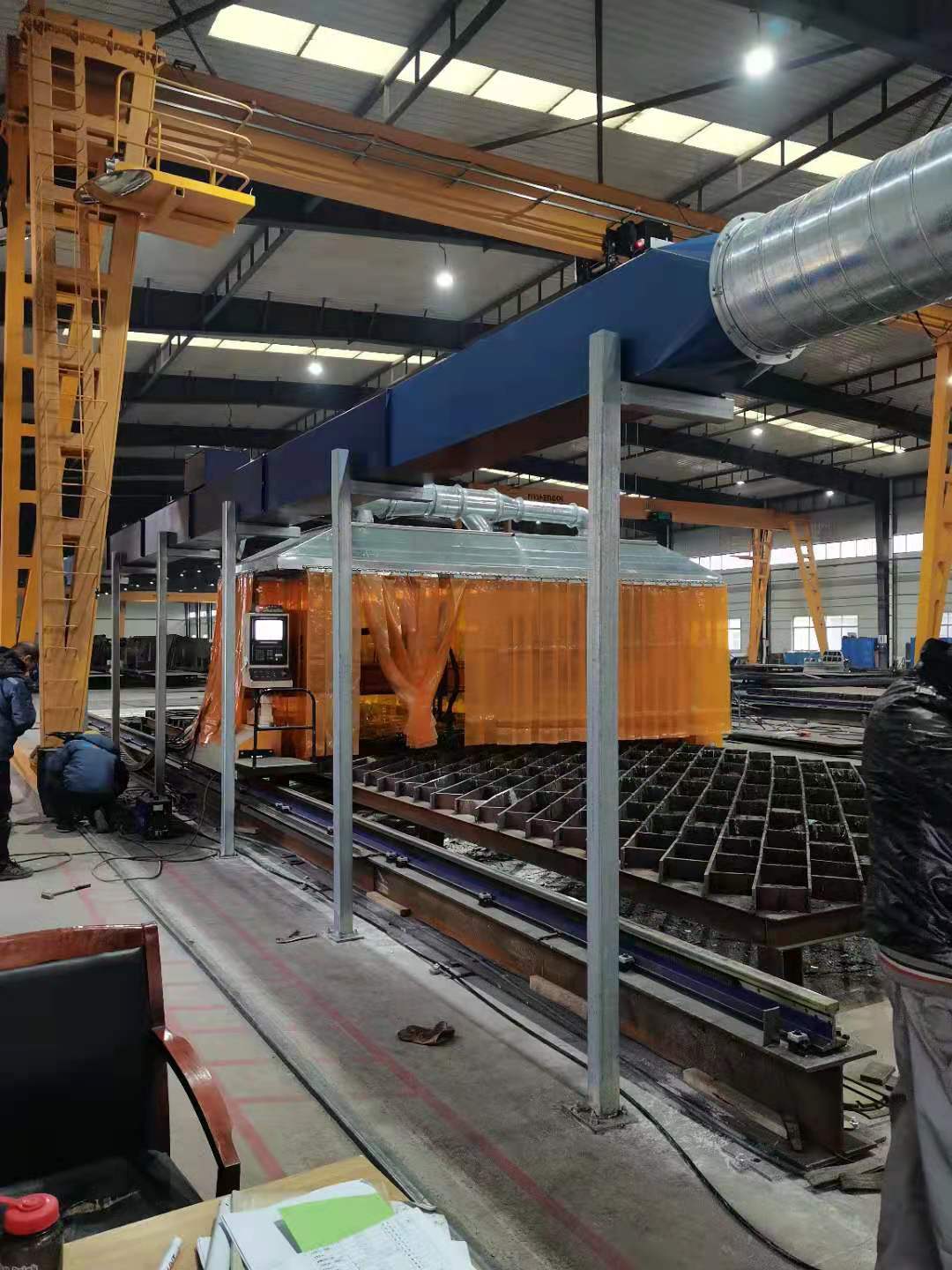 在切割平臺的一側放置一根滑動(dòng)吸風(fēng)道,其上面有一個(gè)可隨切割機一起移動(dòng)的吸風(fēng)口。吹風(fēng)口固定在切割機上,且與切割頭保持在一條線(xiàn)上。切割平臺下部是帶有立板的格柵,與切割的板材形成密封的風(fēng)道,始終保持只在切割的有限寬度內即產(chǎn)生煙塵的部位抽風(fēng)。工作時(shí),密封皮帶在管道負壓的作用下,緊緊地貼附在方形吸風(fēng)道上方,起到密封的作用。在滑動(dòng)吸風(fēng)小車(chē)處,滑動(dòng)吸風(fēng)小車(chē)內有兩個(gè)滾軸;密封皮帶在此處被頂起,這樣煙塵通過(guò)滑動(dòng)吸風(fēng)小車(chē)吸風(fēng)口進(jìn)入方形吸風(fēng)道,最后吸入濾筒凈化器主機過(guò)濾凈化。